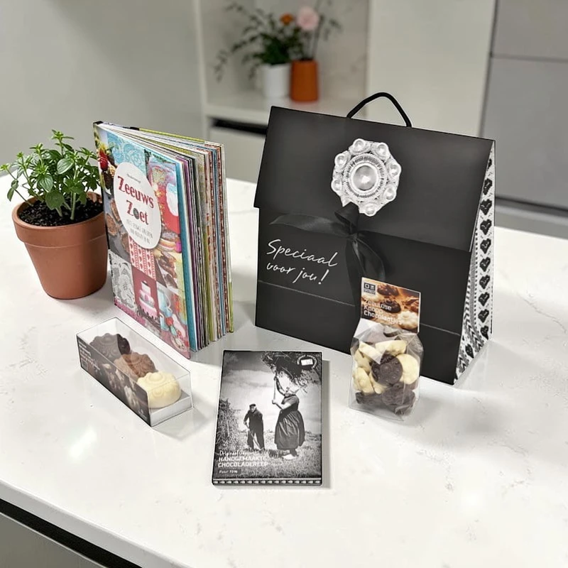 Onze exclusieve Zeeuwse cadeautassen zijn een lust voor het oog en een genot voor de ontvanger. Je kunt ze vullen met alles wat Zeeland brengt. Exclusief en origineel. Neem alleen vormgeving al: met een prominente rol voor de Zeeuwse knop en het unieke Zeeuwse schortenbont. Het is direct duidelijk: dit is een cadeau om niet snel te vergeten. De inhoud bepaal je zelf. Dat wordt misschien nog lastig kiezen uit zoveel originele, echt Zeeuwse producten!